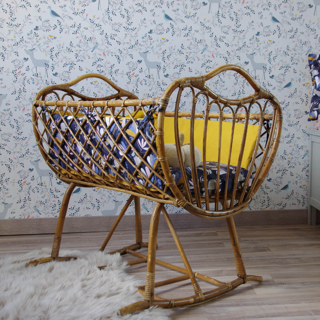 Les berceaux en rotin pour leur part, sur support stable ou sur roulettes, sont réellement le premier lit pour accueillir confortablement le bébé. On craque pour l’élégance inégalable de leurs lignes, le coté romantique de la flèche parfois et ce sentiment d’offrir un petit écrin douillet unique à votre trésor, qui traverse les générations.