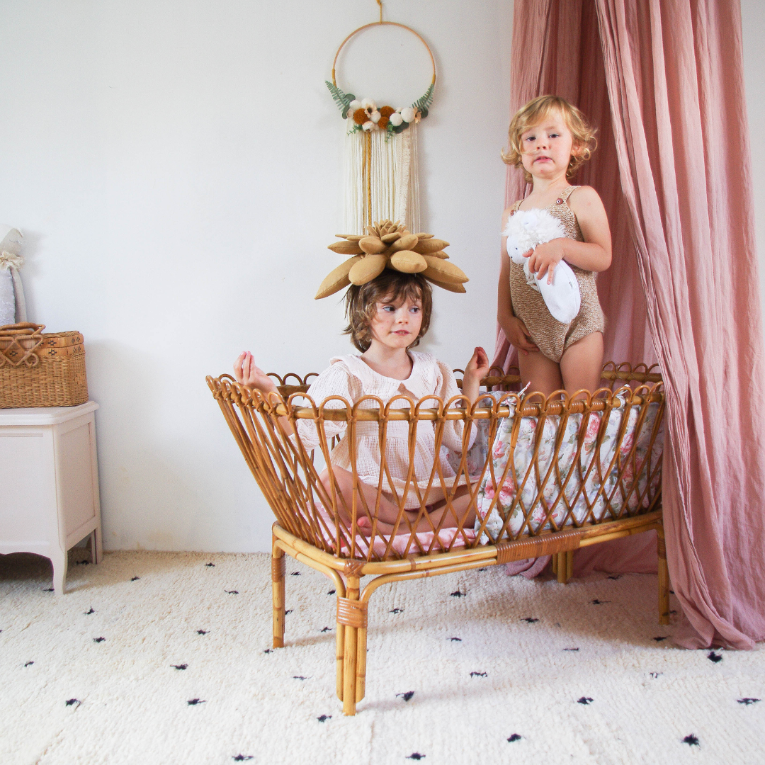 Le lit en rotin grand frère du berceau du même nom, permet d’installer les bébés dans de petits lits qui laissent passer la lumière et l’air, et dont on apprécie le coté en fibre naturel.