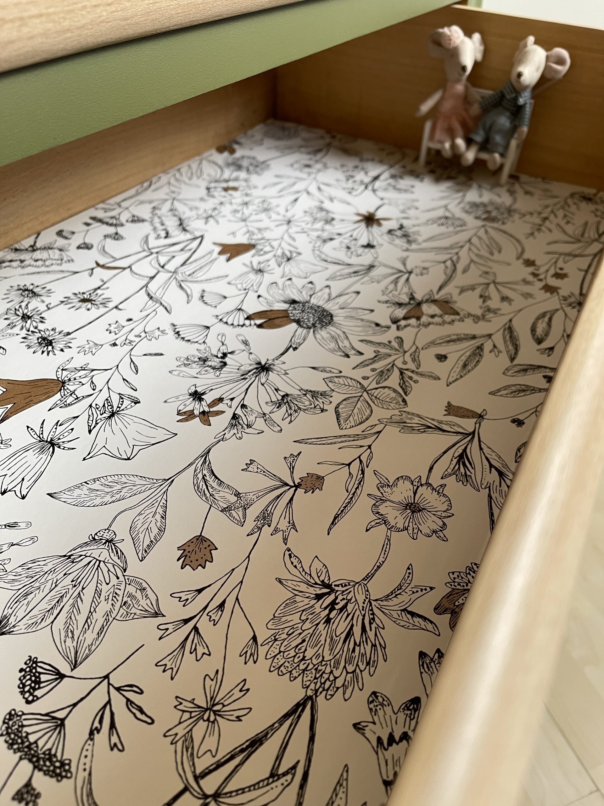 À l’intérieur des tiroirs, vous découvrirez un papier peint floral inspiré des Jardins de Giverny de chez CASELIO.