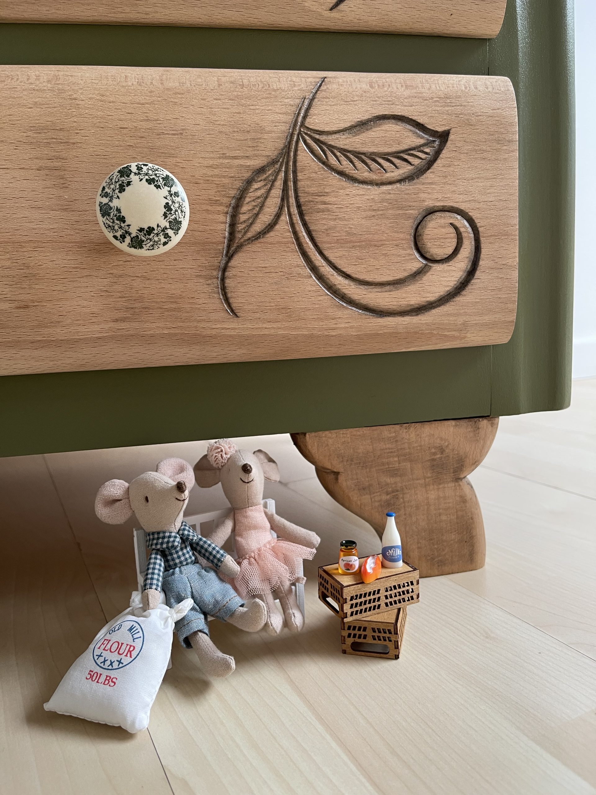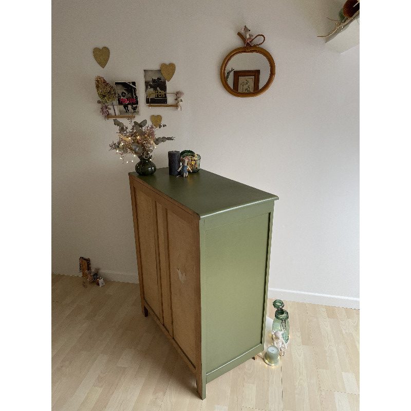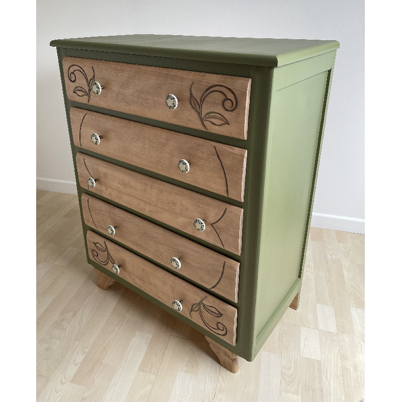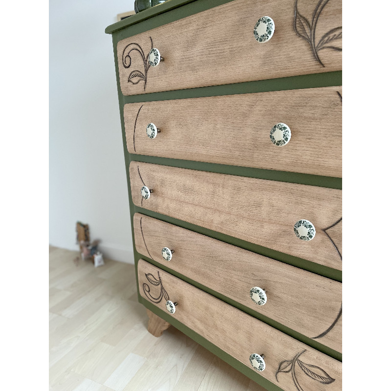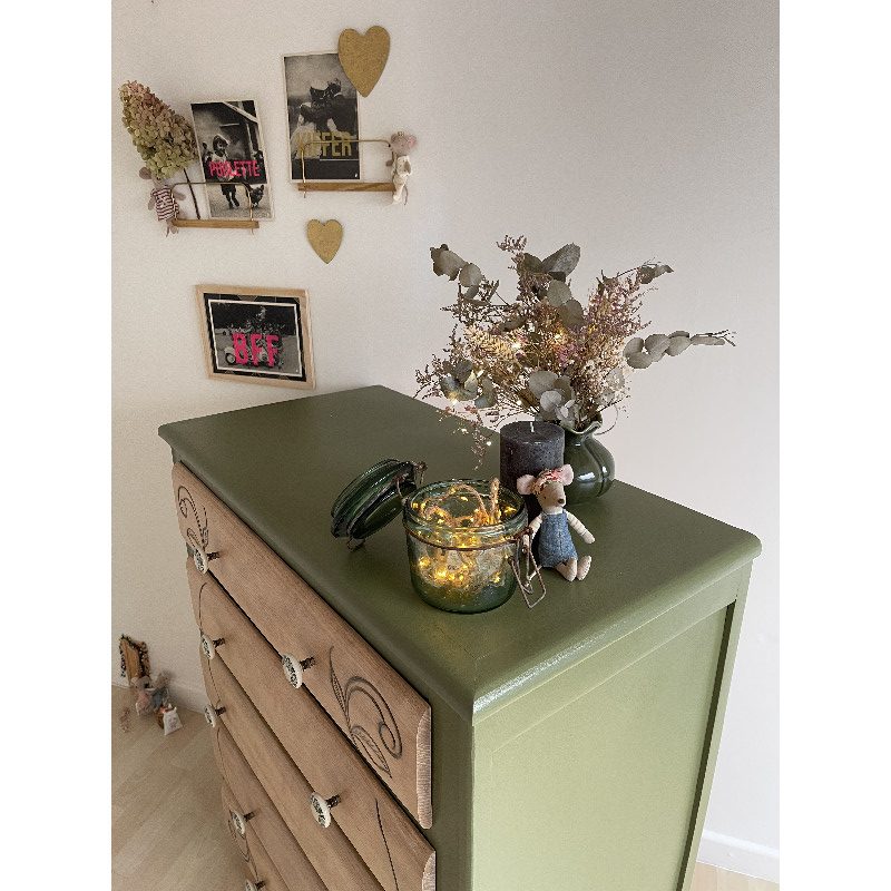 Pour rester dans le thème de la nature, la commode a été peinte en « vert futaie » de chez COLIBRI puis recouverte d’un vernis.