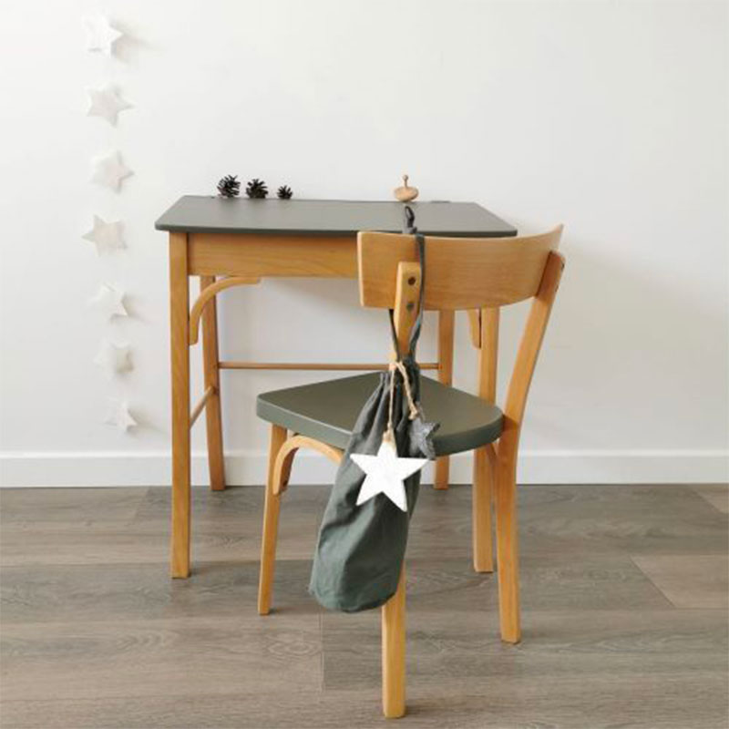 Pour un esprit nature, l’assise de la chaise, le fond du pupitre ainsi que sa tablette ont été peints dans la jolie teinte vert kaki Pompeian Ash de chez Little Greene (peinture agréée chambre d’enfant).