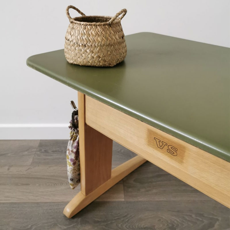 Parties bois poncées et vernis mat. Plateau du bureau laissé avec son revêtement d’origine, résistant et d’une jolie teinte verte.