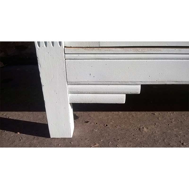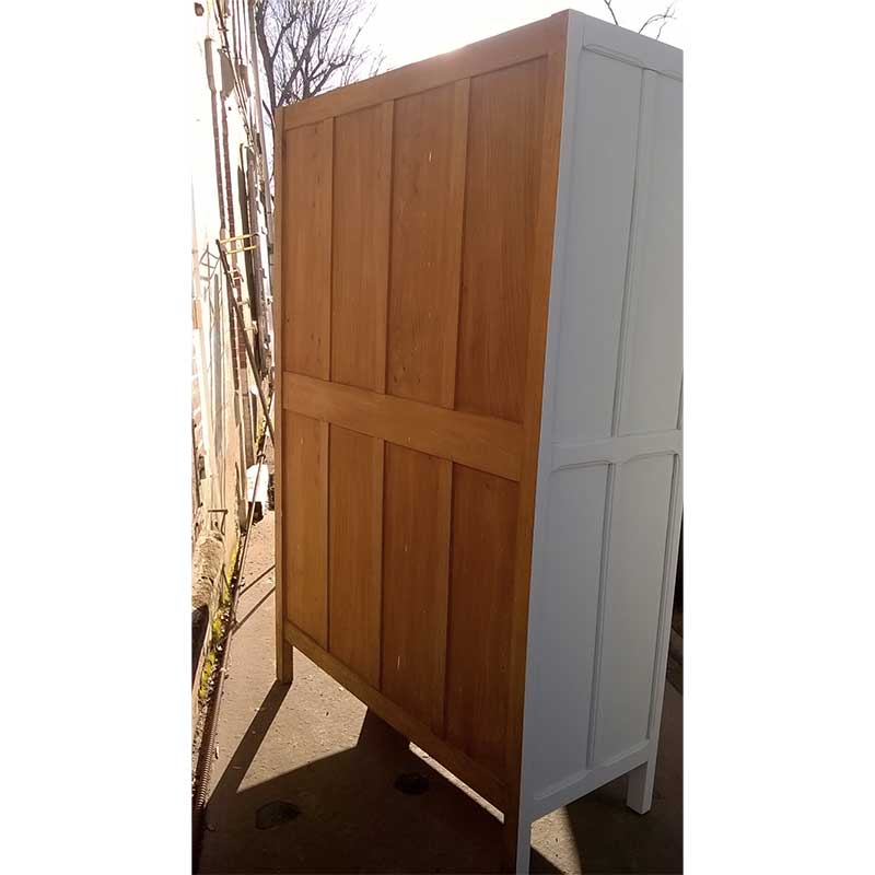 Traité, poncer, et repeinte de couleur bleu vert. Cette armoire a été aménagé d’une grande étagère penderie.