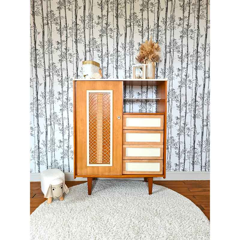 # - années 60 , armoire 4 tiroirs , armoire penderie , armoire vintage , penderie rare , penderie vintage , Petite penderie rotin années 60 , Rotin