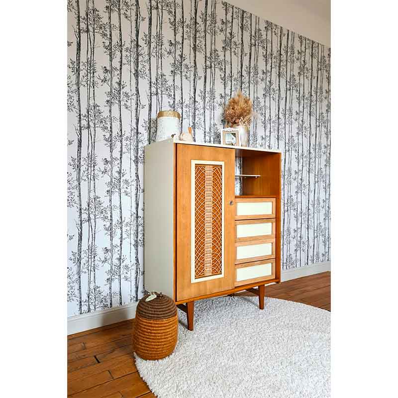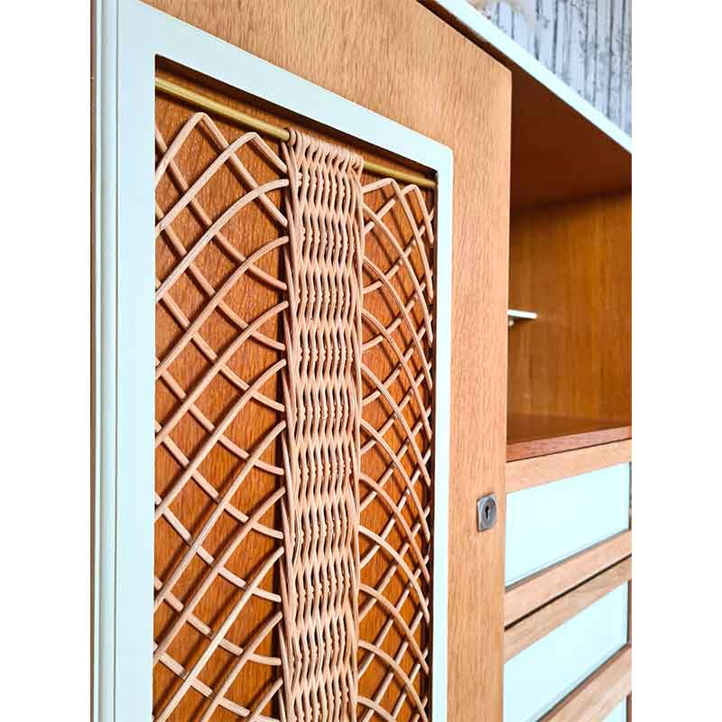 Pieds compas, porte en rotin naturel, 4 tiroirs . Le tout rénové en beige pampa.