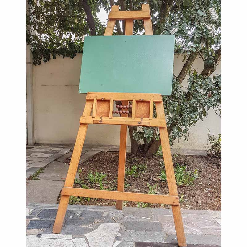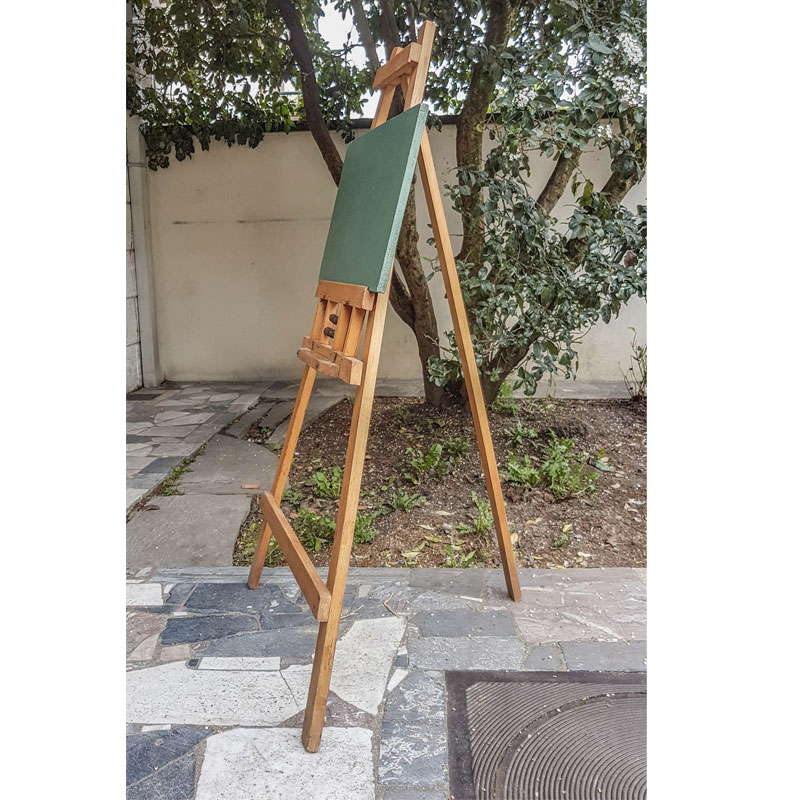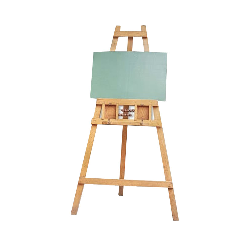 Tableau vert à craie et chevalet pliable en bois.